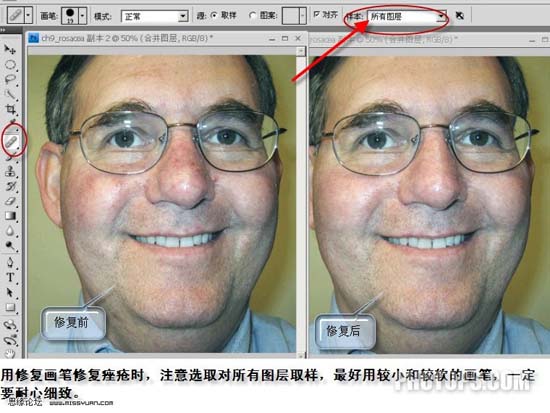 8、用修復畫筆修復時,注意選取對所有圖層取樣,最好用較小和較軟的畫筆,一定要耐心細致。