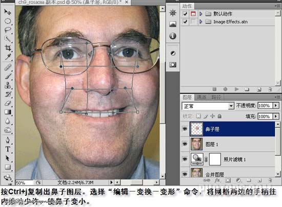 14、按ctrl + j復制出鼻子圖層,選擇:編輯 > 變換 > 變形,命令,將網格兩邊的手柄稍微往內拉一點使鼻子變小。