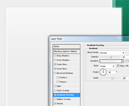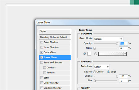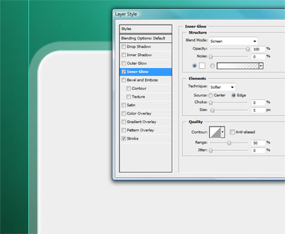 再用內發光工具給側邊欄添加一個白色的邊線效果,方法跟上面的一樣。調整阻塞選項到最大值,可以讓光出現的比較柔和。