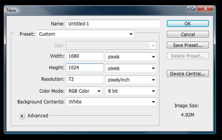 打開ps然后創建一個空白文檔。我比較喜歡在一個大一點寬屏文檔上面開始制作。切記使用rgb色彩模式以及設置為72dpi就好,因為我們緊緊是在屏幕上使用(注,一般印刷是300dpi,而屏幕只要72就夠了,cmyk為印刷色)