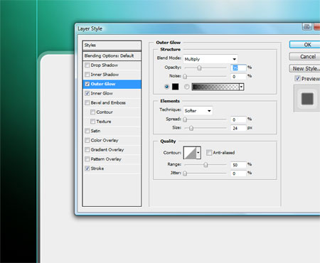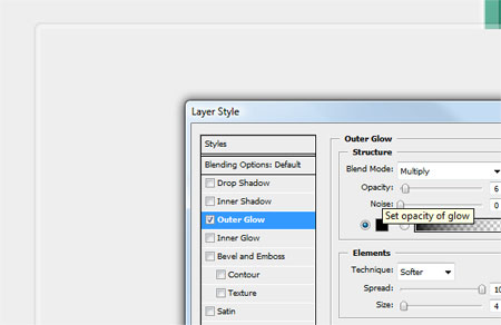 最后添加一個外發光,黑色的15%透明度的,于是一個淡淡的內容區的陰影就這樣出現了。