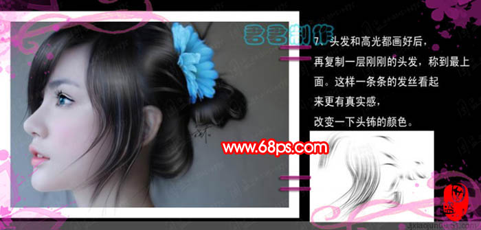 7、頭發和高光都畫好后,再復制一層剛剛的頭發,放到最上面,這樣一條條發絲看起來更有真實感,再稍微干改變下頭飾的顏色。