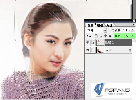 為便于觀察,調整拖進來的圖層的不透明度。將兩幅圖中人物的五官以及頭型對好