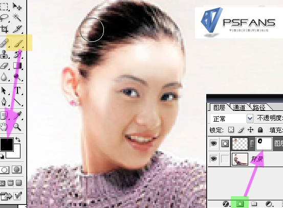 將圖層不透明度恢復為100%,添加圖層蒙版,將前景色設為黑色。選擇畫筆工具,將畫筆硬度調整為20%左右,在不需要的地方涂抹