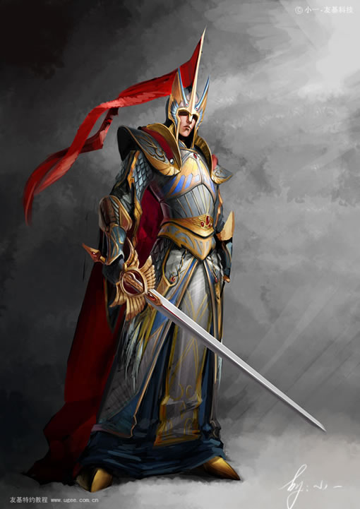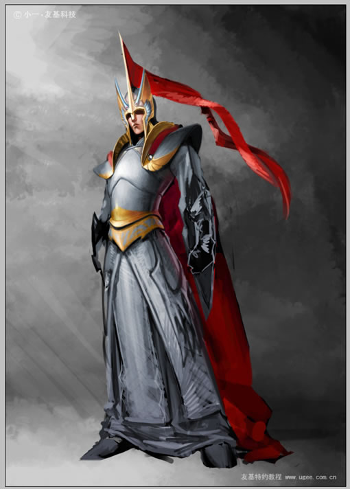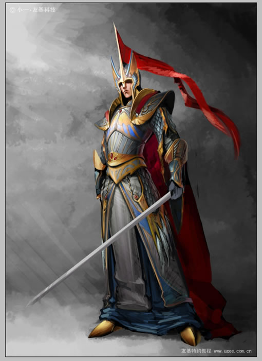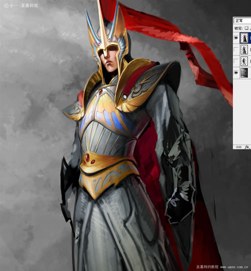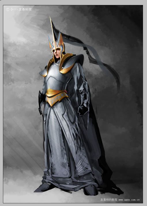 4、素描關系確定了,現在還是為盔甲分色,為了顯示出職業的高級別,我選用金色來進行裝飾。在領部,肩甲邊緣 和腰際用金色分隔開。這樣的好處是可以很清晰的讓人分辨出各個部位。這里要注意同樣是金色,但是由于光和環境的影響所產生的顏色變化。