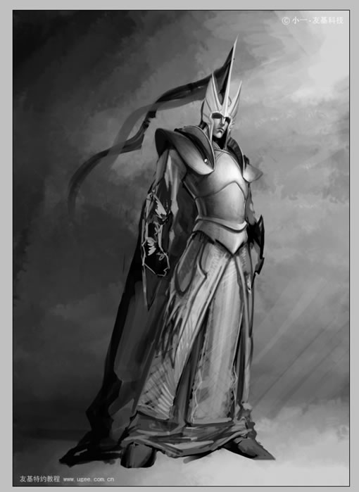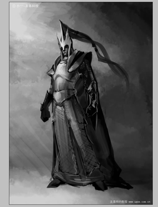 2、當前期準備工作完成后,就要著手進行服飾的設計了。這一步先大概的區分出盔甲的分布形式,我是將它先分為頭盔,肩甲,胸甲,護手,裙甲等大的部分。現階段只要繪制出大概的明暗關系就可以了。