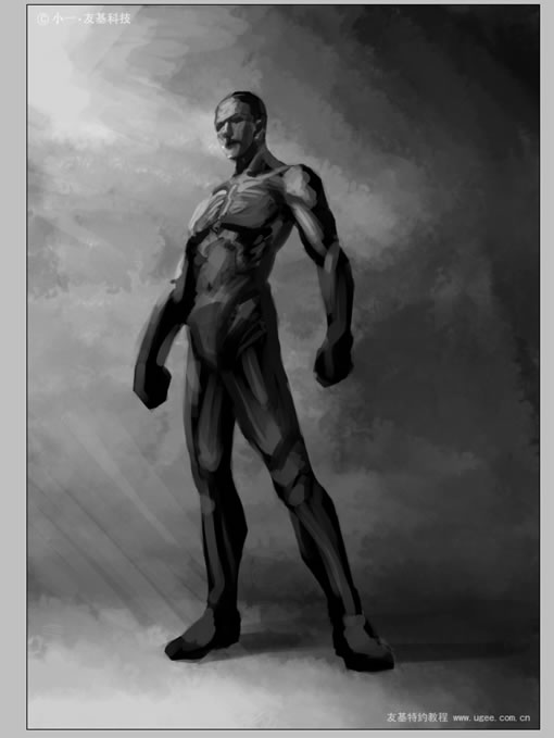 1、第一步是將人物的具體比例和初始姿勢決定下來,我的方法是先用黑色畫出人物的剪影,不斷用橡皮和畫筆調整外輪廓,知道外形和結構都舒服了為止。然后再選用白色結合友基筆的壓感來塑造內部結構。在這個過程中如果對自己的默寫能力懷疑,最好是找一些人體結構方面的書籍圖片來參考下。
