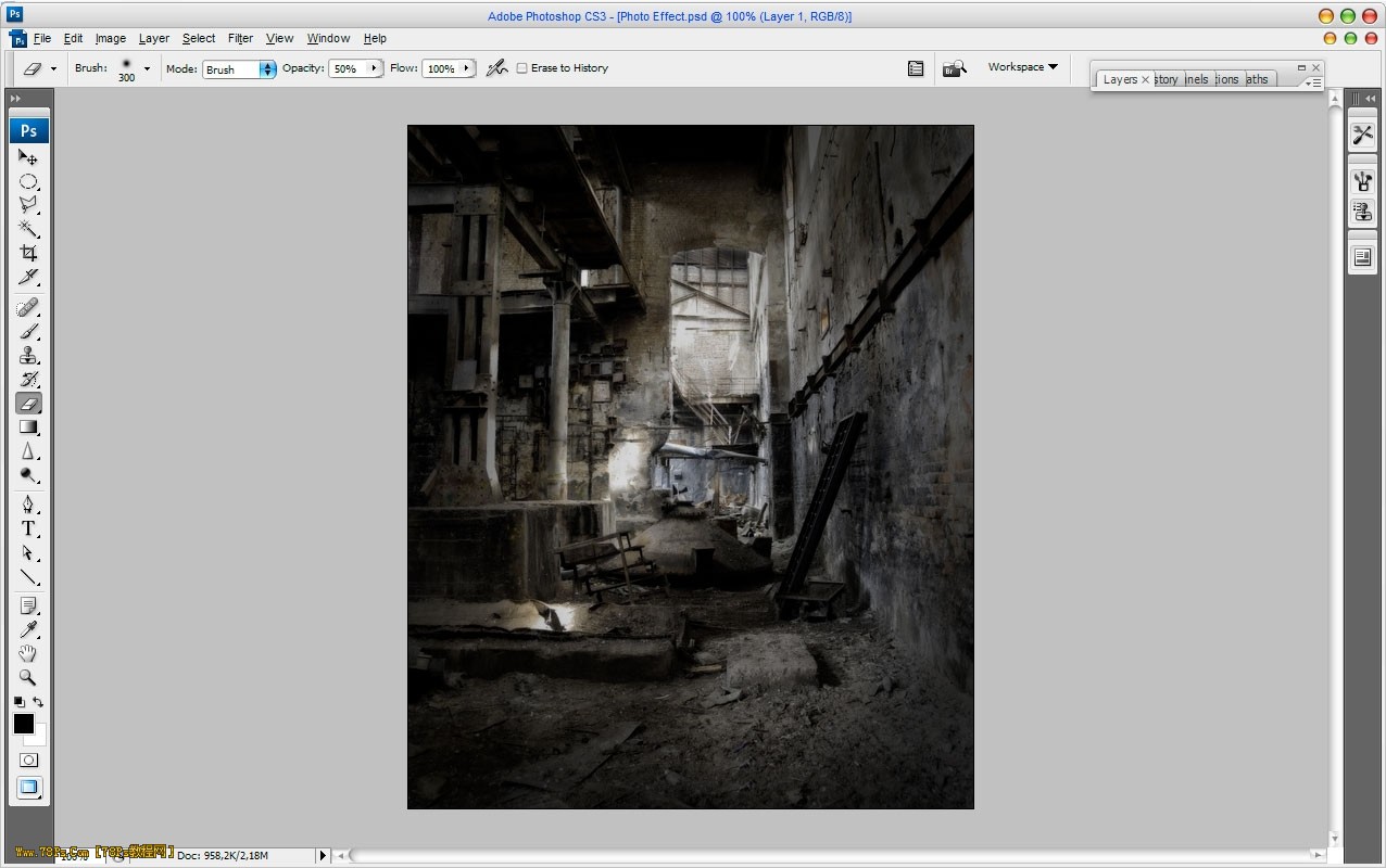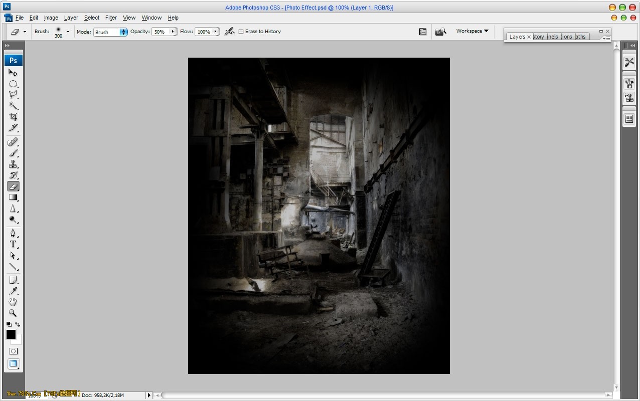 4.現在我們要添加一個黑色區域在背景的邊緣。按ctrl+shift+n新建一個圖層,按shift+f5填充為黑色,然后選擇橡皮擦工具(柔角),大小為300px,不透明度為50%。清除中間的黑色區域,如下圖: