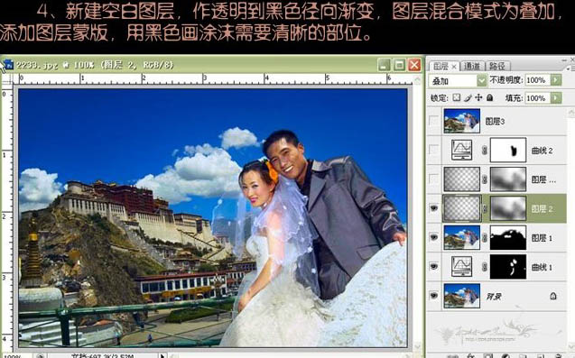 4、新建一個(gè)圖層,選擇漸變工具顏色設(shè)置為透明到黑色漸變,然后由中心向四周拉出徑向漸變,再把圖層混合模式改為“疊加”,加上圖層蒙版用黑色畫筆涂抹需要清晰的部位。