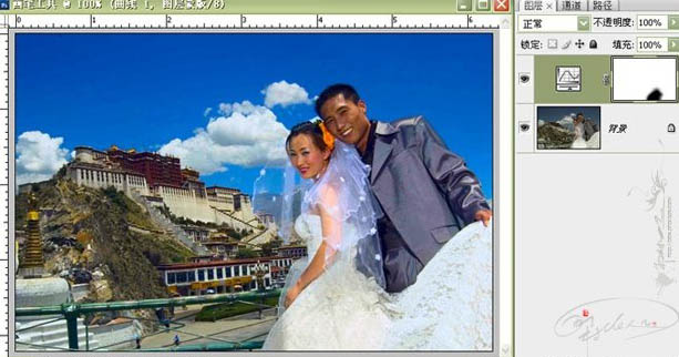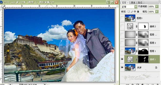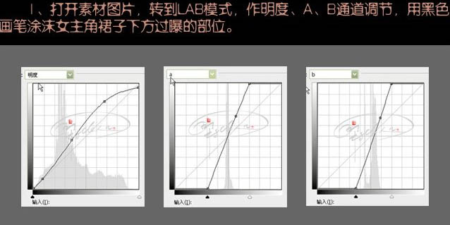 1、打開原圖素材,選擇菜單:圖像 > 模式 > lab顏色,然后創(chuàng)建曲線調(diào)整圖層,對相應(yīng)的三個(gè)通道進(jìn)行調(diào)整,參數(shù)設(shè)置如下圖。確定后用黑色畫筆涂抹女主角裙子下方曝光過度的部位,效果如下圖。