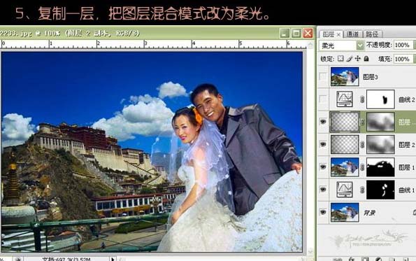5、把漸變圖層復(fù)制一層,圖層混合模式改為“柔光”。