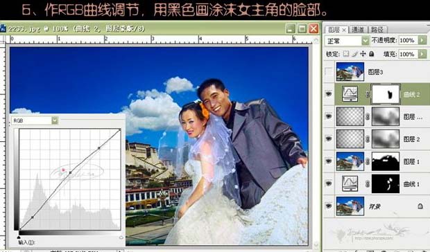 6、創(chuàng)建曲線調(diào)整圖層,對rgb通道進(jìn)行調(diào)整,參數(shù)設(shè)置如下圖,確定后用黑色畫筆涂抹女主角的臉部。