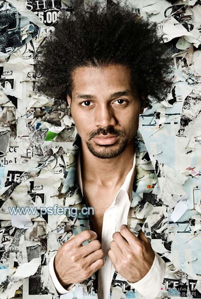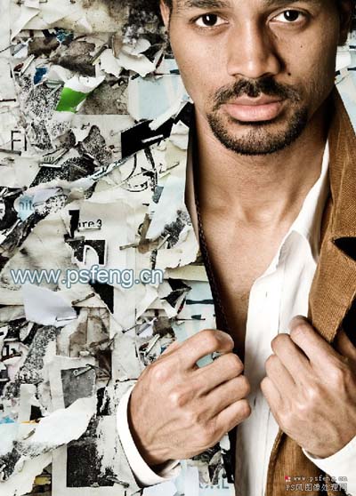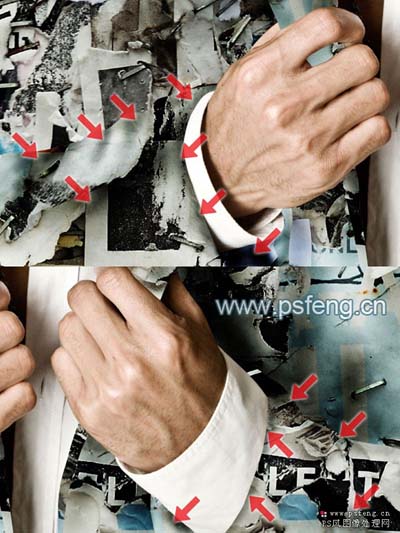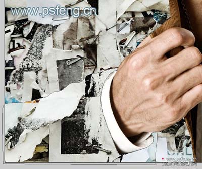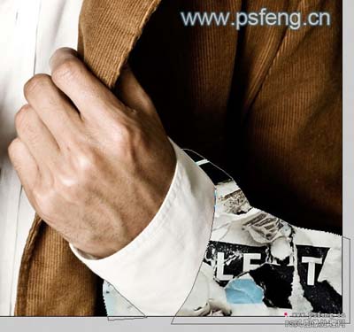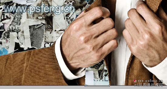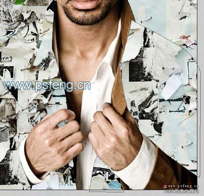 5、現在,我們再復制一層紙張紋理層,也移到后面左側的外套,最好和第4步移的位置不要相同,同樣用鋼筆工具勾出左臂,添加矢量蒙版,然后移到頂層。