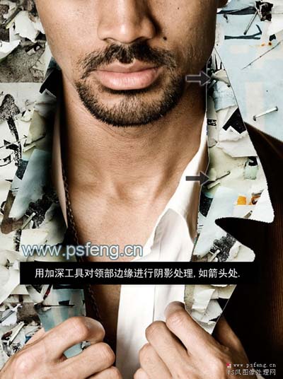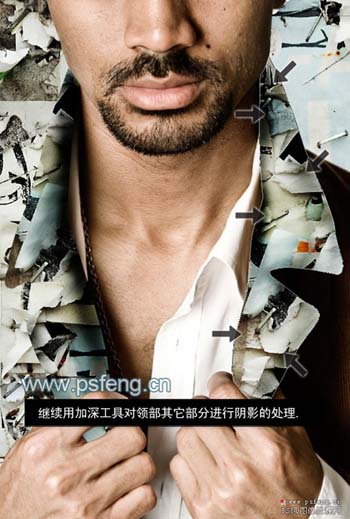 8、各部分全部勾出來后,我們要對其進行明暗處理。 首先對領部進行明暗處理,我們這里用加深減淡工具來處理。選中領部紋理層,然后用加深減淡工具沿邊緣涂抹,如圖中箭頭。