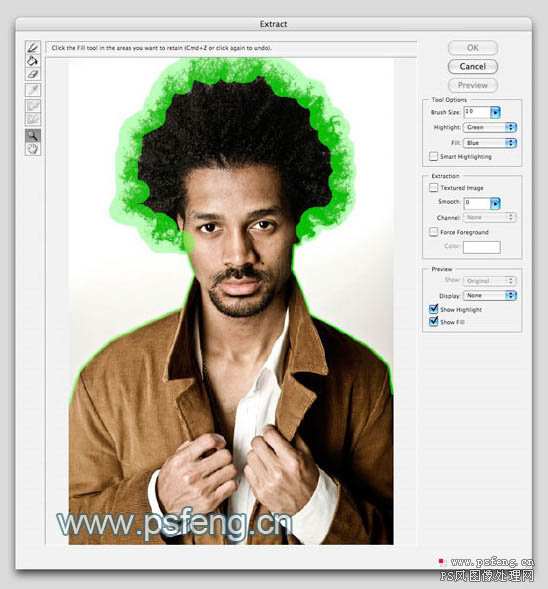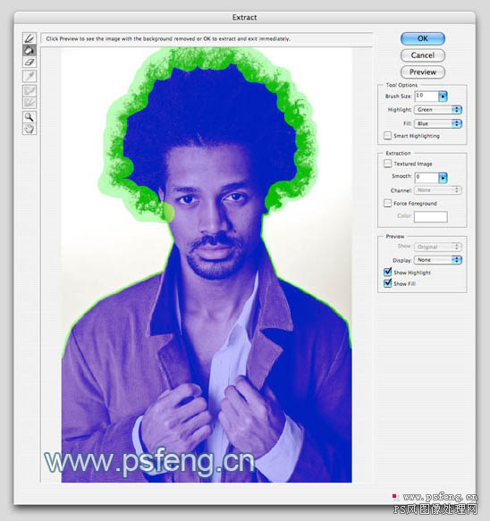 1、我們先要摳出人物素材中的人物,這里我們是用"濾鏡/抽出"來摳出人物,其實還有很多其它的方法,如通道,背景橡皮擦,魔棒等等,根據自己的習慣的實際情況。
