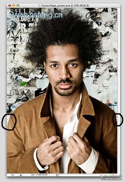 讓我們首先左側開始,復制紋理層。 然后移動位置到后面左側的外套。 確保這層已被選中。 然后拿出鋼筆工具勾出左則外套的一部分。 在用鋼筆勾外套時盡量超過外套一點點,這樣在我們用紋理拼貼時就不出現外套的邊。