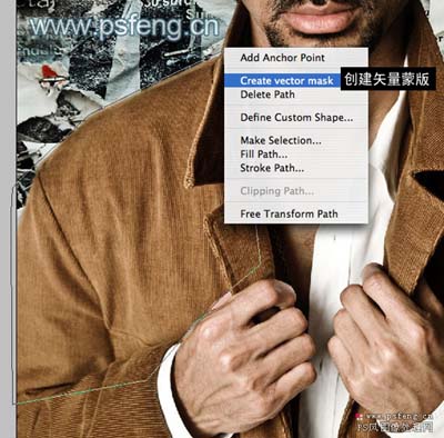 4、然后我們右擊鼠標,選擇創建矢量蒙版。接著我們選中適量蒙板,用鋼筆要具直接在里面勾出手下面那一小塊. 然后移到人物層上,我們就可以看到效果,如圖。