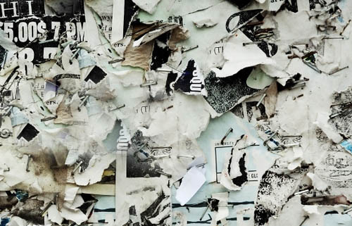 2、把雜亂疊加的紙張素材拖入人物素材里,做為背景層,我們會發現紙張紋理素材不夠在,不能撲滿整個背景,我們把缺口補齊,如果素材不夠可以多復制幾分。