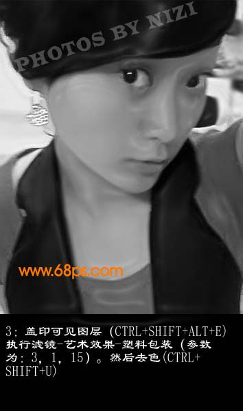| 3、新建一個圖層,按ctrl + alt + shift + e蓋印圖層,執行:濾鏡 > 藝術效果 > 肅靜包裝,數值為:3/1/15,確定后按ctrl + shift + u去色。 |
