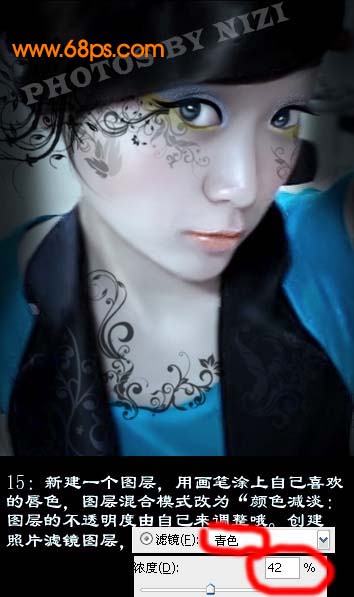 | 15、新建一個圖層,用畫筆涂上自己喜歡的唇色,圖層混合模式改為“顏色減淡”,圖層不透明度由自己來調整,確定后再創建照片濾鏡調整圖層,參數設置如下圖。 |