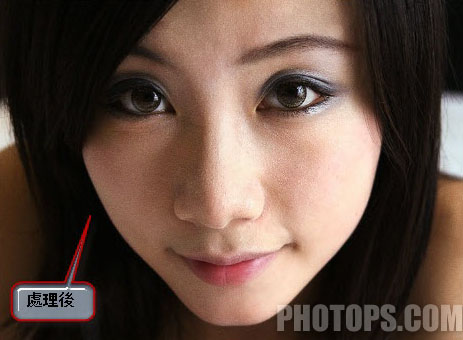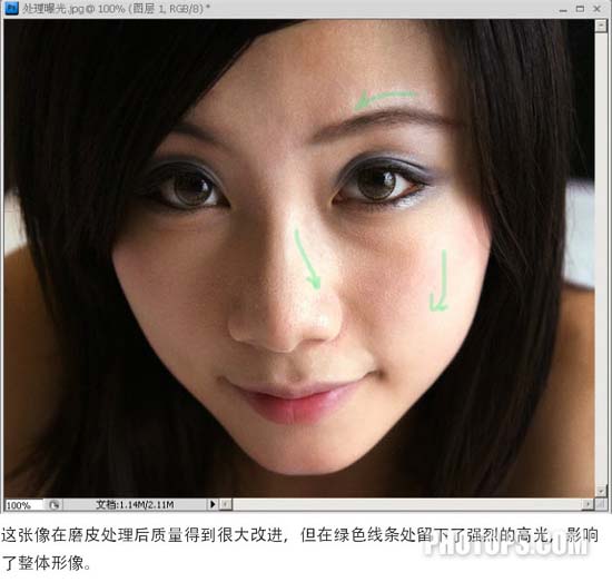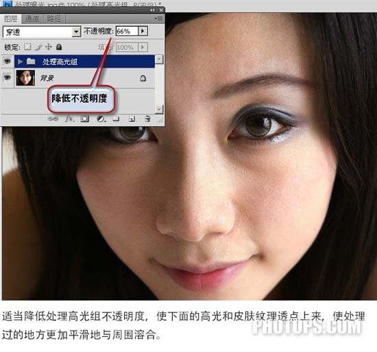 8、適當減低處理高光組不透明度,使下面的高光和皮膚紋理透點上來,讓處理過的地方更加平滑地與周圍融合。