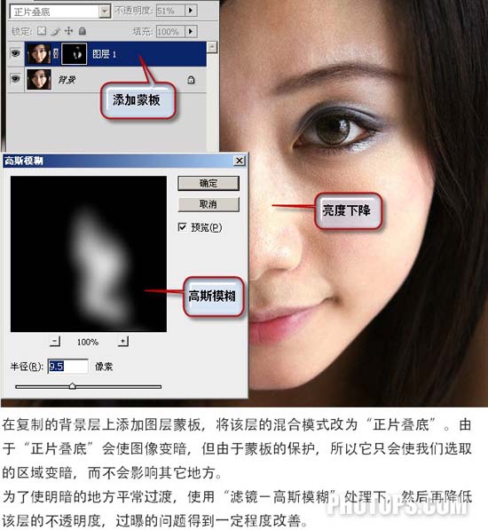 3、加上圖層蒙版,把圖層混合模式改為“正片疊底”。由于“正片疊底”會使圖像變暗,但由于蒙版的保護,所以它只會使我們選取的區域變暗,而不會影響其它地方。為了使明暗的地方平常過渡,再執行:濾鏡 > 模糊 > 高斯模糊,數值自定,然后再適當降低該層的不透明度,過曝的問題得到一定程度改善。