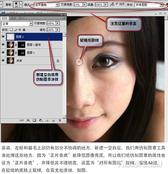 5、鼻梁、左臉和眉毛部仍有部分不協調的地方。新建一空白層,我們用仿制圖章工具來處理這些地方。因為“正片疊底”能降低圖像亮度,所以我們把仿制圖章的屬性頁設為“正片疊底”,并降低其不透明度,數值為“對所有圖層取樣”,按住alt鍵在較暗的皮膚上取樣,在高光處涂抹,如下圖。