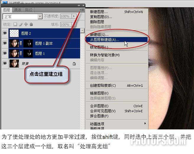7、為了使處理的地方更加平常過度,按住shift鍵,同時選中上面三個層,并把這三個層建成一個組,取名叫處理高光組。