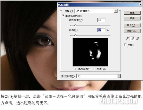 2、把背景圖層復制一層,選擇菜單:選擇 > 色彩平衡,設置好容差和范圍,然后用吸管在圖像上高光過亮的地方點擊,選出過曝的選區。