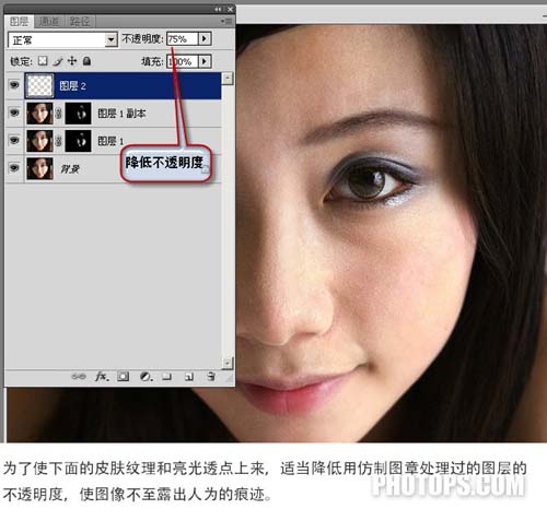 6、為了使下面的皮膚紋理和亮光透點上來,適當降低用仿制圖章處理過的圖層不透明度,使圖像不至露出人為的痕跡。
