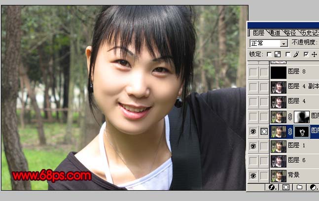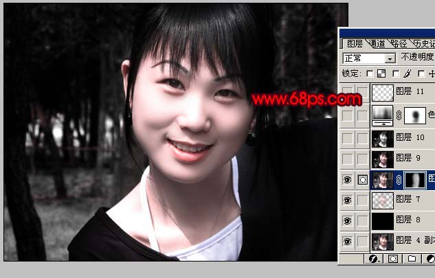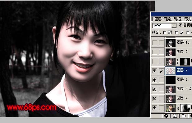 6、把黑色填充圖層下面的蓋印圖層復(fù)制一層,按ctrl + shift + ]移到圖層最上面,按住alt鍵加上圖層蒙版,用白色畫筆稍微把人物臉部涂出來,效果如圖7。
