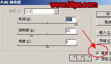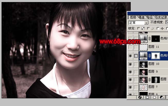 8、創(chuàng)建色相/飽和度調(diào)整圖層,參數(shù)設(shè)置如圖9,勾選著色選項(xiàng)。確定后用黑色畫筆把人物部分涂出來,再把圖層不透明度改為:50%,效果如圖10。