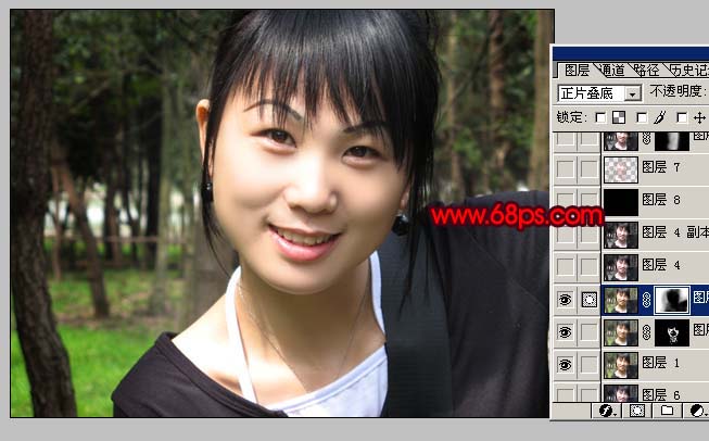 3、新建一個圖層,蓋印圖層,把蓋印后的圖層混合模式改為“正片疊底”,加上圖層蒙版用黑色畫筆把人物部分擦出來,效果如圖3。