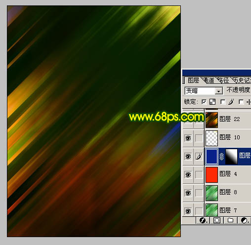 | 10、再剛才操作的圖層下面新建一個圖層,填充深藍色:#08208a,把圖層混合模式改為“變暗”,加上圖層蒙版用黑白漸變由右上至左下拉出透明效果,如圖12。 |