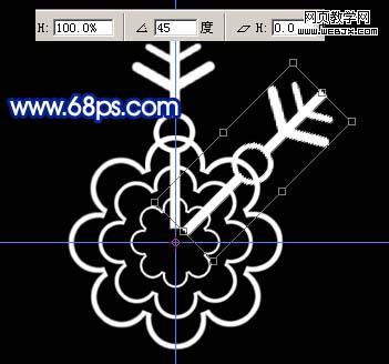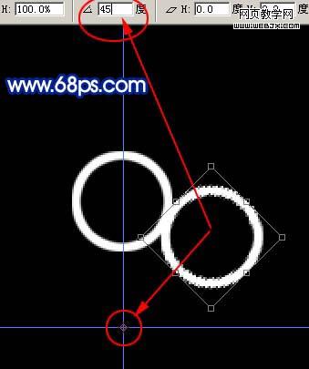 | 3、按ctrl + j把圓環圖層復制一層,按ctrl + t變形,把編輯中心移到參照線交點位置,再在屬性欄把角度設為45度,具體設置如圖4,然后按enter確認效果如圖5。 |