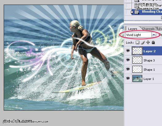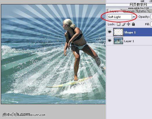| 5、最后,設置射線的圖層模式為柔光。如下圖所示: |
