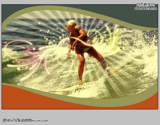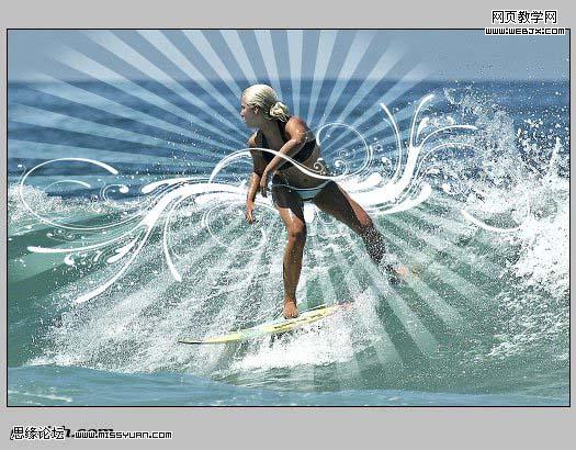 本教程的色調及創意非常不錯。簡單的利用沖浪女孩素材,通過一系列的調色及增加裝飾效果打造出一幅非常出色的效果。制作的過程不多,不過作者的細節及局部裝飾做得很棒,值得學習。