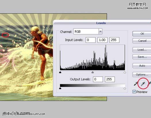| 17、下一步是給圖片制作一些樂模和陳舊的效果,就像通常在沖浪公司里看到的那些廣告一樣。要達到70年代的黃色觀感也許只需一步,但我們可以多嘗試幾次,以取得最佳效果。按ctrl+l,打開色階板,通道選擇rgb,點擊中間的吸管,定義我們我們在這張圖片上期望的中間色,我選的是背景圖片海面的深藍色,取得了一個感官良好的黃色。你也可以嘗試點選其他地方得出不同的效果,但基本上是選擇深色和藍色,從而達到下圖效果。 |