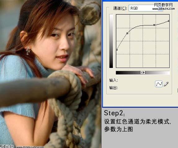 | 2、雙擊紅色通道曲線調(diào)整圖層,曲線設(shè)置如下圖,確定后把圖層混合模式改為“柔光”。 |