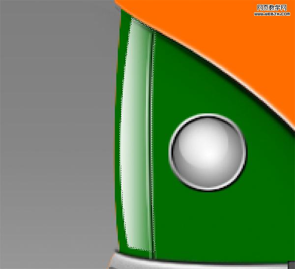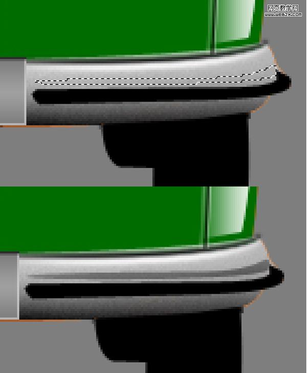 新建圖層,建立如圖所示選區,用白色填充,為保險杠也加上光澤效果。現在把這個圖層透明度設為60%。接著復制這個圖層到車的另一端。