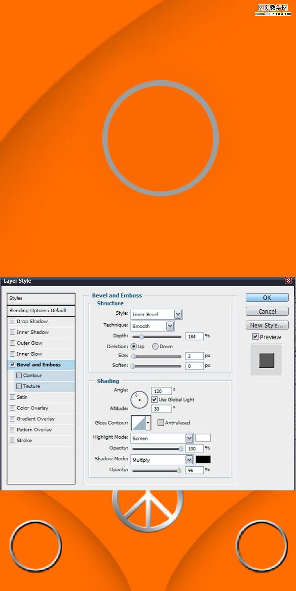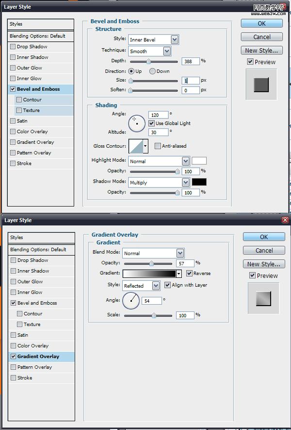 現在來做車燈吧。使用橢圓選區工具(m),先建一個新層,畫出形狀然后右擊選區,選擇描邊,然后把寬度設為3px,顏色為#7a7a7a。做好要用的形狀后,雙擊這個新層,然后到斜面和浮雕選項,如圖所示加上效果。在另一個車燈上重復這些操作。
