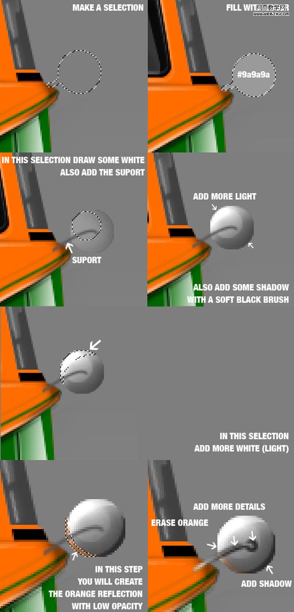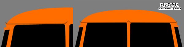 現在來為車篷加點光澤效果。如圖所示建立一個選區,接著使用徑向漸變工具從白色到透明填充。然后把這個圖層復制并移到車的另一邊。