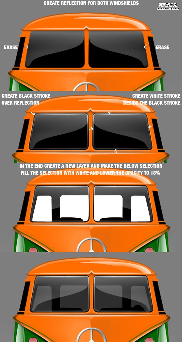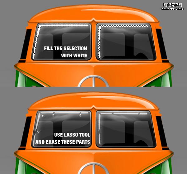 是時候處理擋風玻璃并讓它們變透明了。用和以前一樣的方法:新建圖層,建立選區,用白色填充,然后擦除或者降低不透明度。
