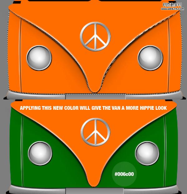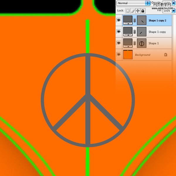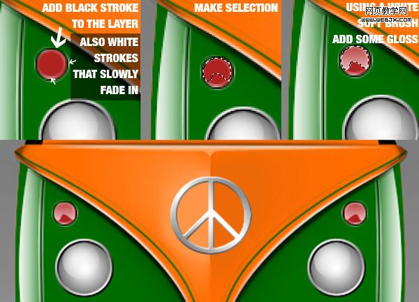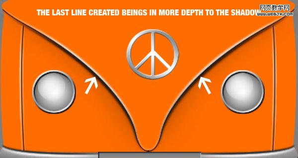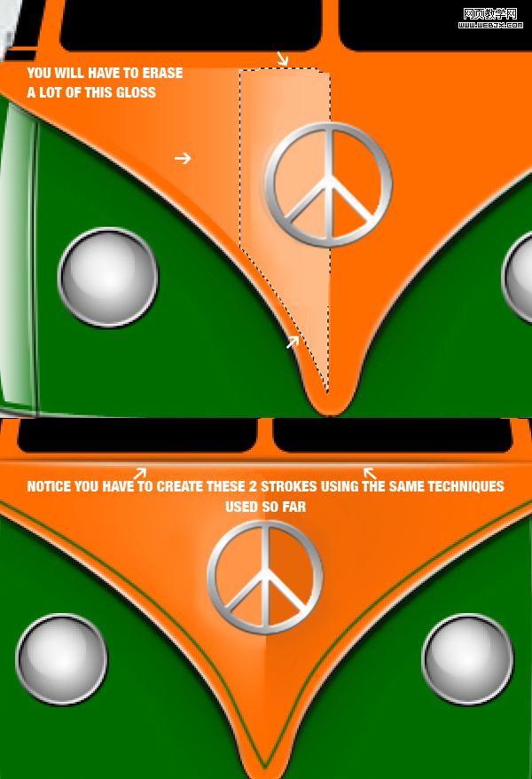 重復步驟12,不過這一次你要把這些線條放到車的不同地方。黑色線頭畫好后,復制到它的上面。跟之前一樣,用反相變為白色。使用橡皮擦工具輕輕地擦出部分線條。你還需要另做跟白色線條一樣的線,不過保持黑色不變,放到第一條線的下面。跟上面一樣,用顏色加深工具在橙色圖層上加上輕輕的陰影。