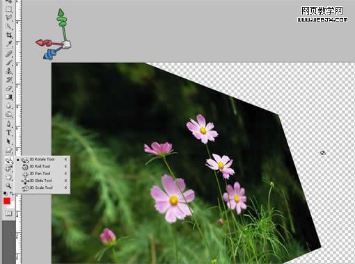 相對于cs3時如雞肋般的三維功能,cs4對三維支持可謂有了翻天覆地的變化。在工具箱中增加了兩組專門的三維工具,一組用來控制三維對象,一組用來控制攝像機。菜單中新增了從圖層新建三維明信片(new 3d postcard from layer)命令,可以把普通的圖片轉換為三維對象。并可以使用工具和操縱桿來進行調整其位置、大小和角度等。