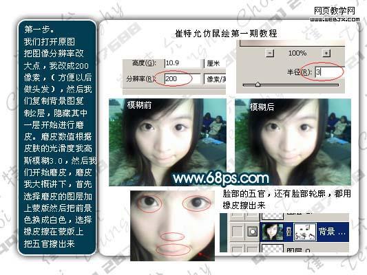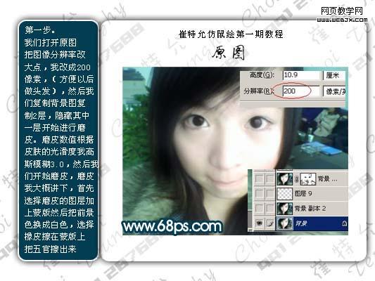 1、打開原圖,把圖像分辨率改大一點(diǎn)(圖像 > 圖像大小),我改成200像素,把背景圖層復(fù)制2層,隱藏其中一層。對需要磨皮的圖層執(zhí)行:濾鏡 > 模糊 > 高斯模糊,數(shù)據(jù)根據(jù)皮膚的光滑度而定,這里模糊3像素,然后加上圖層蒙版,把前景色換成白色,選擇橡皮擦在蒙版上把五官擦出來。