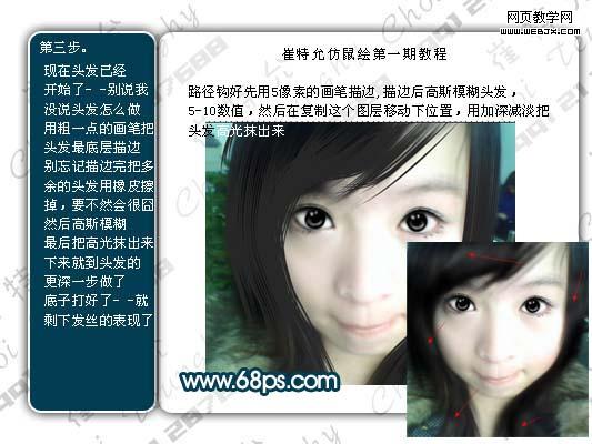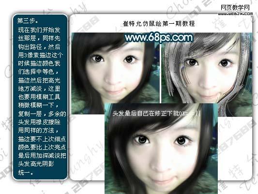 3、開始處理頭發(fā)。用鋼筆工具勾出路徑,用粗一點(diǎn)的畫筆描邊,別忘記描邊完把多余的頭發(fā)用橡皮擦擦掉,要不然會很不自然。然后高斯模糊,總體處理好后,用加深減淡工具把頭發(fā)高光涂出來。