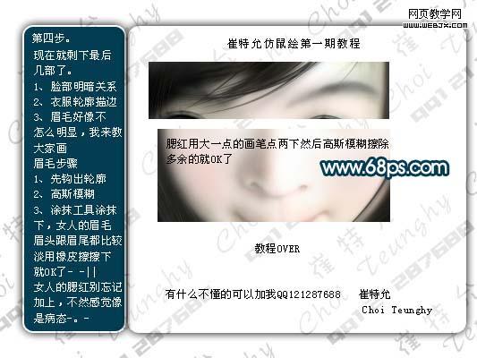 c、眉毛好像不怎么明顯,可以自己畫,先用鋼筆勾出輪廓,適當(dāng)?shù)母咚鼓:?,選擇涂抹工具涂抹,女孩子的眉毛眉頭跟眉尾都比較淺,用橡皮工具擦一下就可以了。最后加深腮紅完成最終效果。