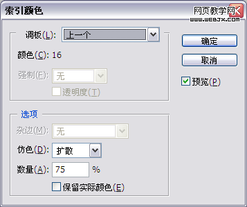 二、圖像菜單---->模式---->索引顏色,打開(kāi)如下面板