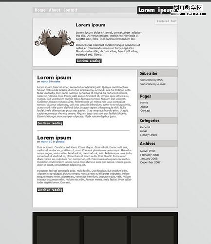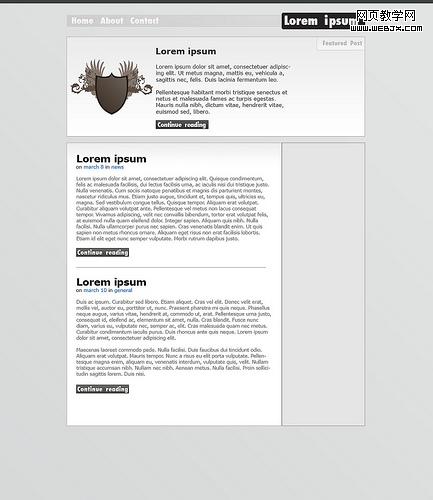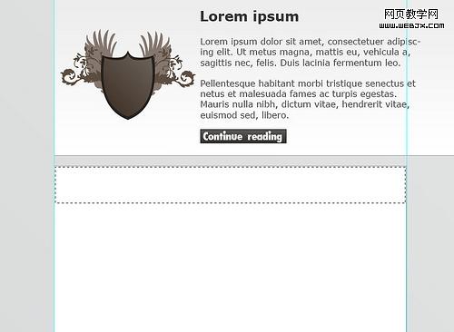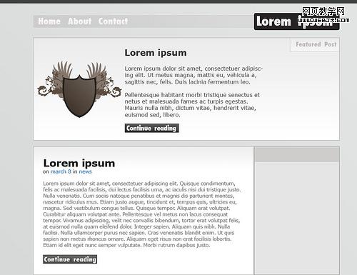11)create a new layer, make a rectangle selection like the one from the next image and add a linear gradient #ececec to white. write the title of a post with the font verdana, the color #191917 and the size 30 pixels. write the content of a post with the same font, the color #7d7d7b and the size 15 pixels. copy and paste the continue reading button and place it at the end of the post. create a new layer and, make a selection with the fixed size 570 x 1 pixel and fill it with the color #afaeac.